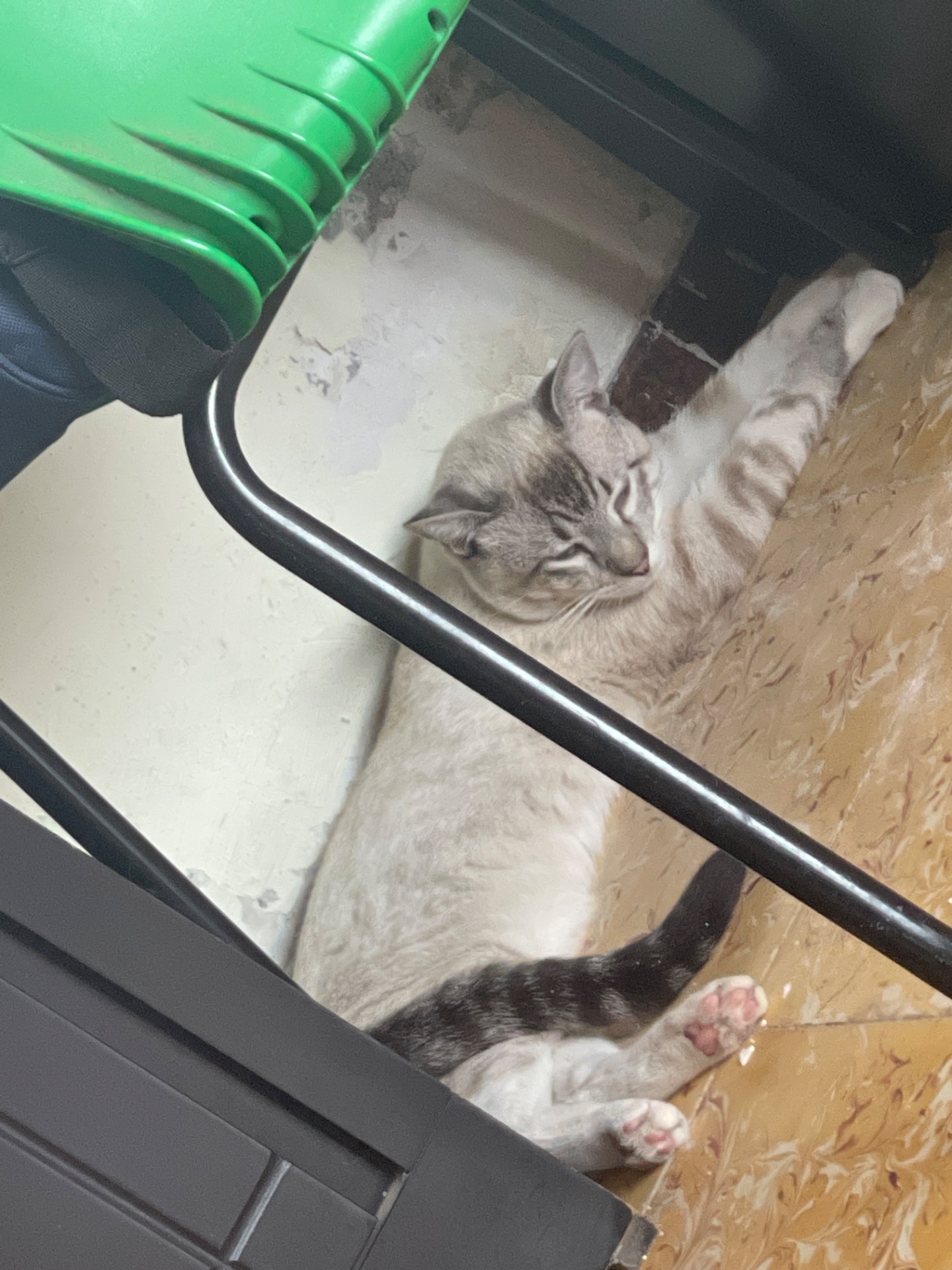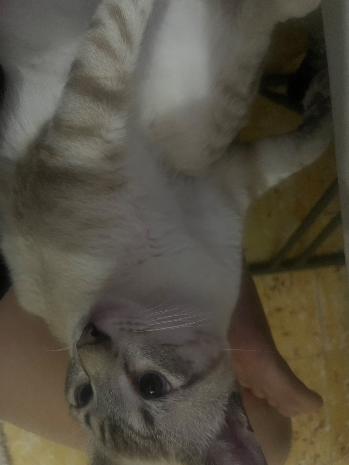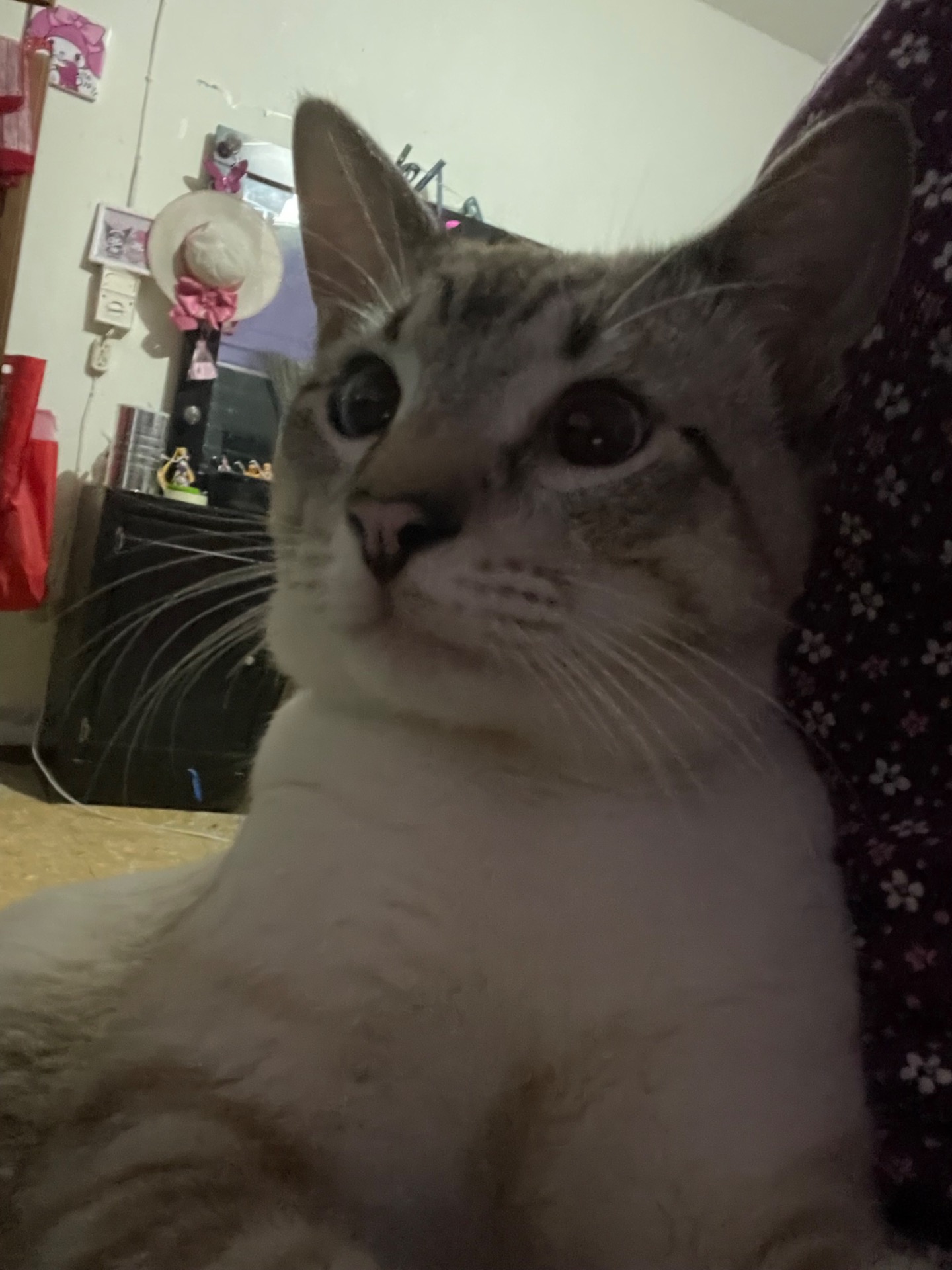 Copito es un gato de color blanco con colores grisáceos de tonalidades oscuras.